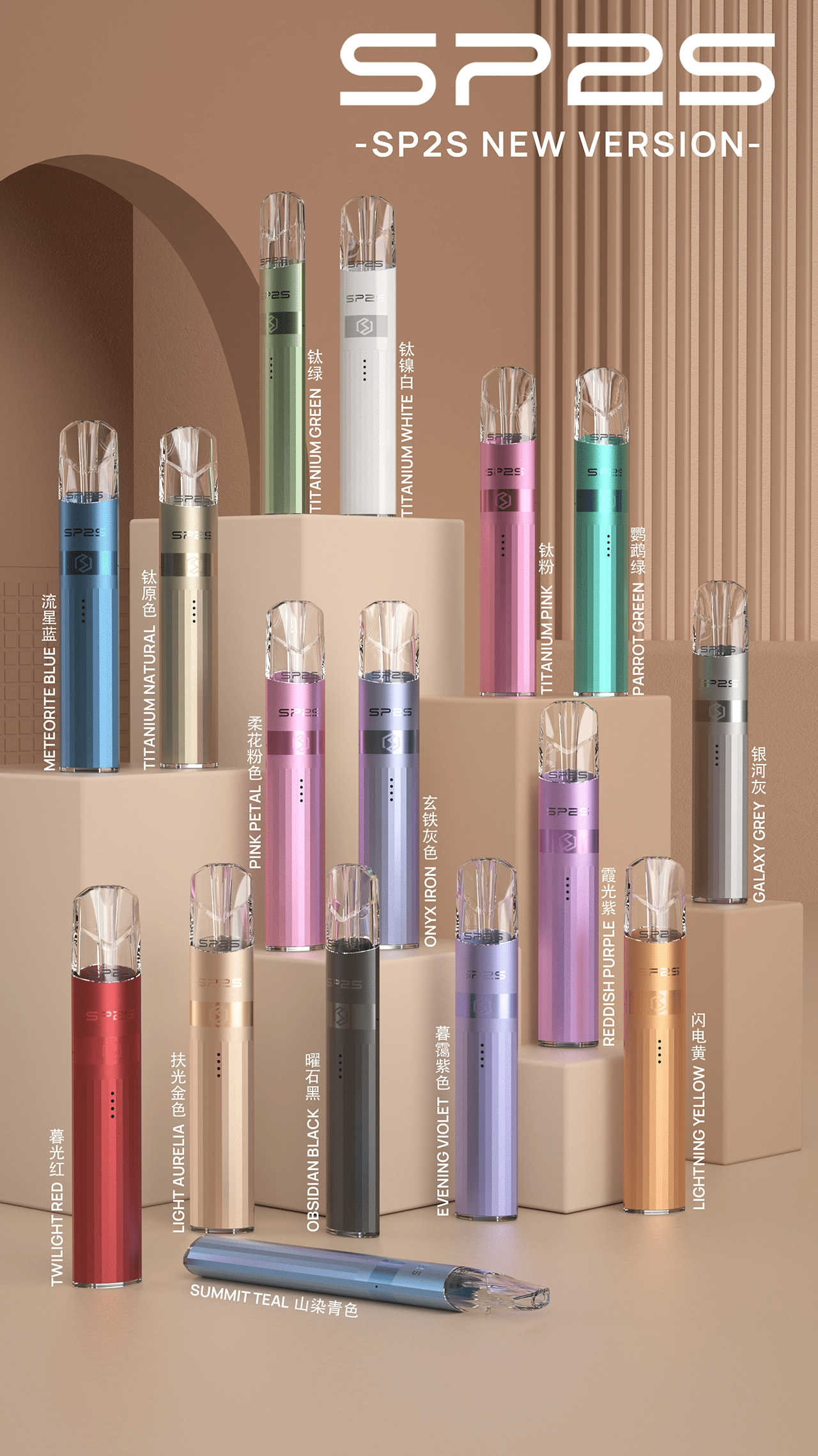 SP2S 鈦金屬主機以沉穩大氣的鈦色金屬為設計靈感,搭配流暢線條與高質感外殼,兼具時尚與耐用性。內建高效電池與智慧輸出系統,確保霧化穩定與長時間續航。通用一代設計,可搭配多款煙彈,操作簡單即插即用,是追求性能與質感並重使用者的理想選擇。